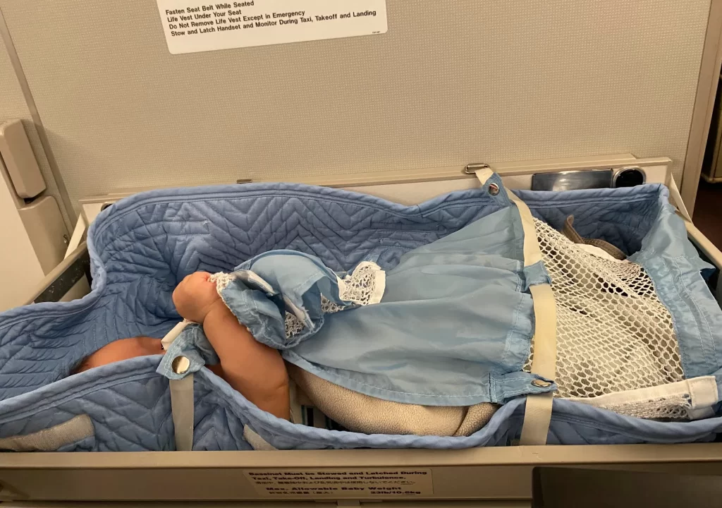 JAL日本航空のバシネットは、赤ちゃんを機内で寝かせるための簡易ベッドを貸してもらえるサービスです。